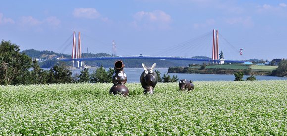 진도대교를 배경으로 만개한 메밀밭은 소나무 언덕 위에 나무와 황토로 지어진 흔들의자, 대형지게, 허수아비, 원두막이 조성되어 한폭의 풍경화를 연출하고 있다.
