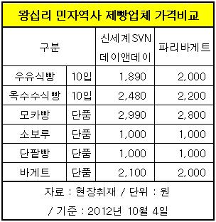 모카빵(2천990원)도 파리바게트(2천800원)보다 110원 비쌌고, 바게트(2천100원)도 파리바게트(2천원)보다 100원 비쌌다.