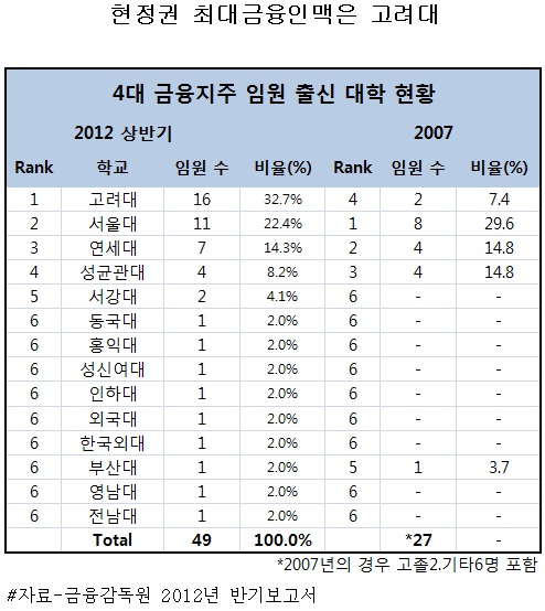 지난 2007년 말 기준 4대 금융지주 임원 중 고려대 출신은 단 2명으로 전체의 7.4%에 불과했으나 올 상반기말 현재는 모두 16명으로 32.7%를 차지, 25.3%포인트나 높아졌다.