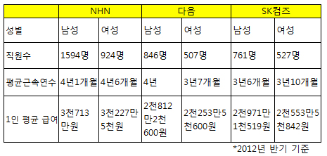 국내 포털 3사인 NHN과 다음커뮤니케이션, SK커뮤니케이션즈 가운데 올해 반기까지 지급된 급여가 제일 많은 곳은 NHN이였다. 그러나 직원들의 평균 근무연수는 무척 짧아 직원 변동성이 심한 것으로 조사됐다.
