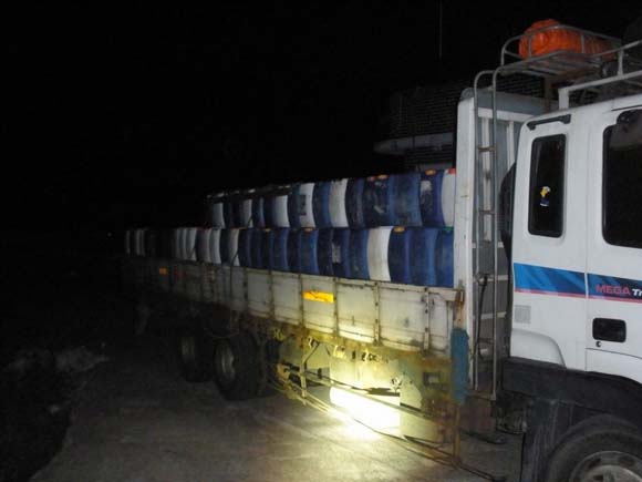 김 양식에 사용이 금지된 무기산(酸)을 대량으로 야간에 어촌마을로 운송하던 화물차가 해경 검문검색에 적발됐다.