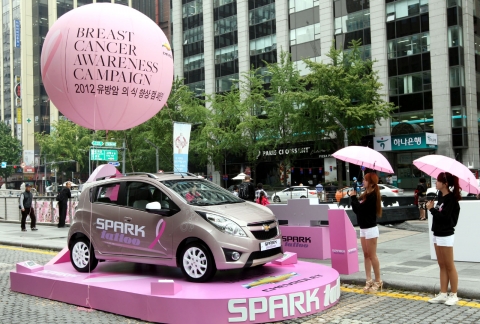 한국지엠은 캠페인 기간 동안 쉐보레 스파크 핑크 모델에 버블 모양의 타투 스페셜 데칼(Decal)을 부착한 스파크 타투 에디션을 청계광장 행사장에 전시하고 유방암 환자들에게 전하는 희망의 메시지를 전하는 ‘핑크 리본 희망의 메시지’ 캠페인을 펼친다.