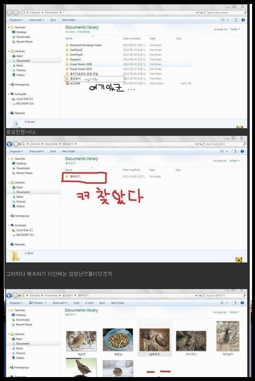 그러나 이 '메추라기' 문서에는 진짜 메추라기 사진들만 잔뜩있어 누나를 실망시킨다.