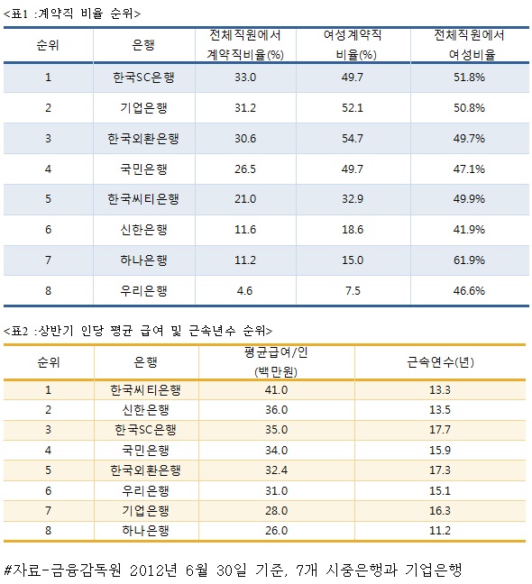 기업은행과 한국외환은행도 계약직 비율이 30%가 넘는 31.2%와 30.6%로 비정규직 비율 2,3위의 불명예를 차지했다.