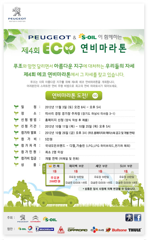 푸조의 공식 수입원 한불모터스(대표 송승철)와 에쓰오일(S-OIL)이 공동 주최하는 ‘제4회 푸조·에쓰오일 에코 연비마라톤’이 오는 11월3일 열린다.