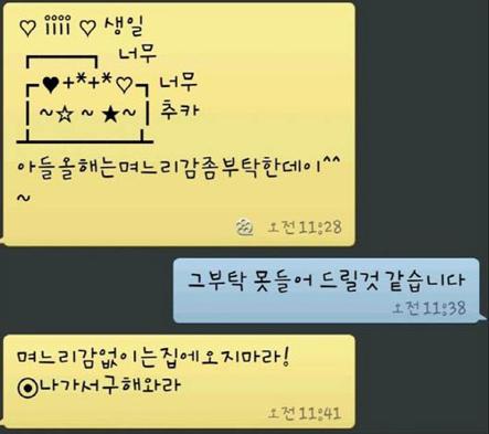 엄마는 아들에게 화려한 이모티콘과 함께 "생일 축하. 아들 올해는 며느리감 좀 부탁한데이"라고 메시지를 보냈다.