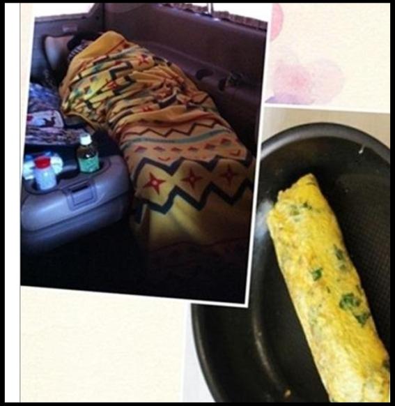 공개된 사진에는 지아가 차 안에서 노란색 담요를 돌돌 말고 자고 있다.