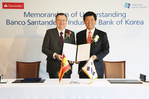조준희 기업은행장(사진 오른쪽)과 알프레도 사엔츠 산탄데르은행장은 국제통화기금(IMF)ㆍ세계은행(WB) 연차총회의 바쁜 일정에도 직접 만나 상호협력 및 교류를 약속했다.