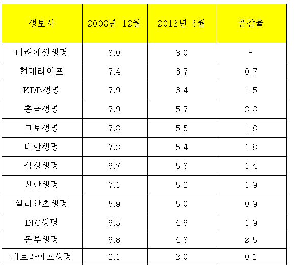 동부생명은 2.5%포인트 떨어졌으며 흥국생명(2.2%P), ING생명(1.9%p), 신한생명(1.9%p), 교보생명(1.8%p)대한생명(1.7%p), KDB생명(1.5%p), 삼성생명(1.4%p) 등이 1%포인트 넘게 낮아졌다.