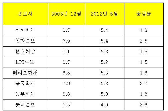 아울러 한화손해보험(2.5%p), 현대해상(1.9%p), 동부화재(1.8%p), 메리츠화재(1.6%p), LIG손해보험(1.5%p), 삼성화재(1.3%p)는 1%포인트 넘게 인하했다.