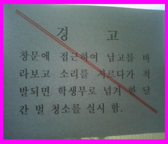 해당 사진은 한 여고 내 붙은 경고문을 찍은 것으로 “창문에 접근해 남고를 바라보고 소리를 지르다가 적발되면 학생부로 넘겨 한 달 간 벌로 청소를 실시함”이라고 쓰여있다.