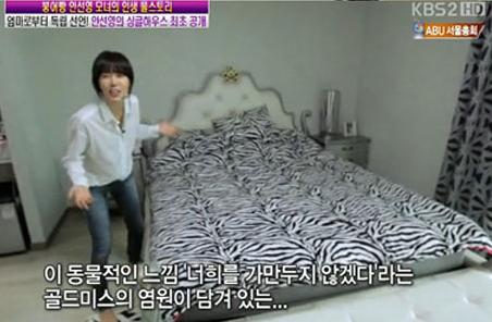 안선영은 “동물적인 느낌의 이불이다. ‘너희를 가만두지 않겠다’라는 골드미스의 염원이 담겨있다”고 말해 폭소를 자아냈다.
