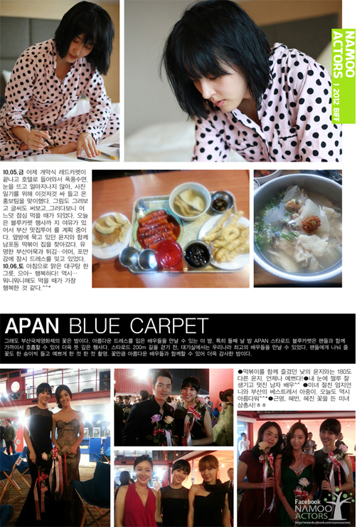 그밖에 나무엑터스 페이스북에는 한혜진 외에 부산국제영화제에 참여한 김강우, 김아중, 김주혁, 김효진, 문근영, 이윤지, 전혜빈, 지성 등의 일기와 가방 속, 폴라로이드 사진 등 부산에서의 나무엑터스 소속 연예인들의 일상이 공개돼 있다.
