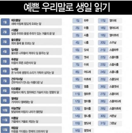 우리말로 생일 읽기 사진은 1월부터 12월까지를 우리말로 이름지어내 한글이 주는 특유의 따뜻함을 전하고 있다.