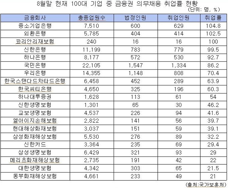 금융권의 의무고용 성적도 평균 이하에 머물렀다. 국내 100대 기업 중 금융권역별 국가유공자 등의 의무채용 취업률 현황을 보면 은행권의 경우 중소기업은행과 외환은행이 각각 104.8%, 102.5%로 의무고용을 완벽하게 준수했다.
