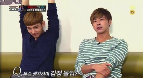유노윤호는 14일 방송된 MBC 예능 프로그램 '일밤-승부의 신'에서 UV와 대한민국 최고의 듀오를 가리기 위해 두 번째 종목 '눈물 빨리 흘리기' 대결을 벌였다.