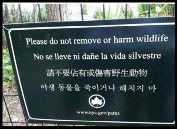 안내표지판에는 영어와 중국어 한국어로 안내문을 적어놓았다. 특히 한국어로 '야생 동물을 죽이거나 해치지 마'라는 반말이 적혀있다.