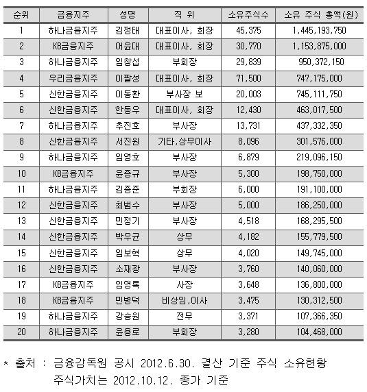 억대 자사주를 가진 임원수가 가장 많은 곳은 신한금융으로 8명이었고 다음은 하나금융 7명, KB금융 4명 등이었다. 반면 우리금융은 억대 자사주 보유자가 이팔성 회장 한사람 뿐이었다.