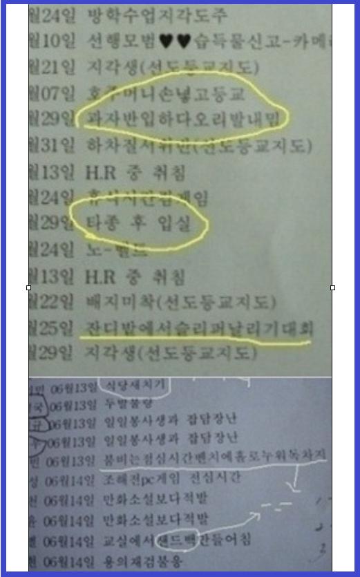 이어 또 다른 사진에는 '식당새치기', '붐비는 점심시간 벤치에 홀로누워 독차지', '교실에서 샌드백 만들어 침'등의 다양한 벌점 사유가 시선을 끈다.