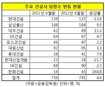 대우건설도 작년 6월 말 62명에서 올해 6월 69명으로 7명 늘었다. 증가율도는 11.3%로 2위를 기록했다.