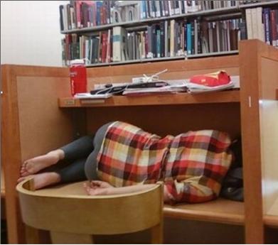 공개된 사진 속 한 여성은 도서관에서 공부 중 피곤한 나머지 기이한 자세로 잠을 자고 있어 눈길을 끈다.