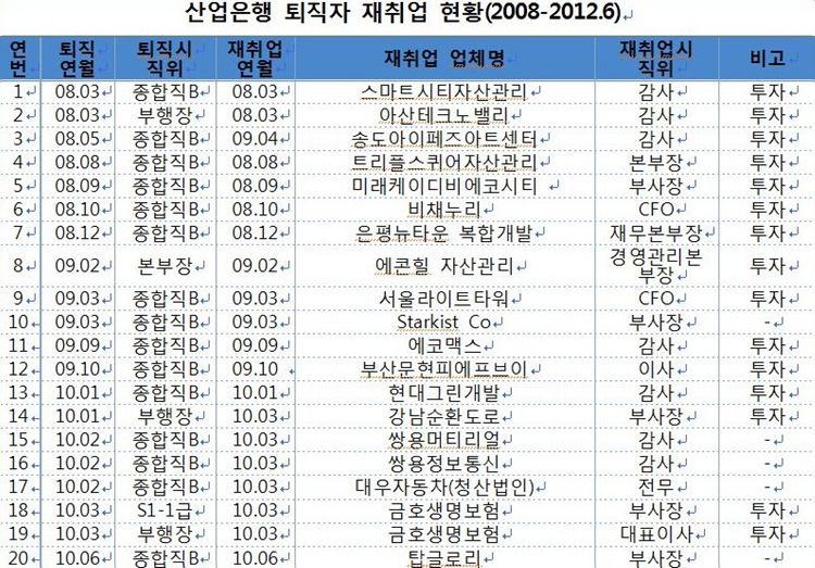특히 33명 퇴직과 같은 달에 재취업이 이루어졌고, 나머지 7명도 퇴직 후 2개월 이내에 재취업에 성공했다. 지난 2011년 이후 재취업한 18명 가운데 9명은 산업은행이 대출한 업체에 재취업했다.