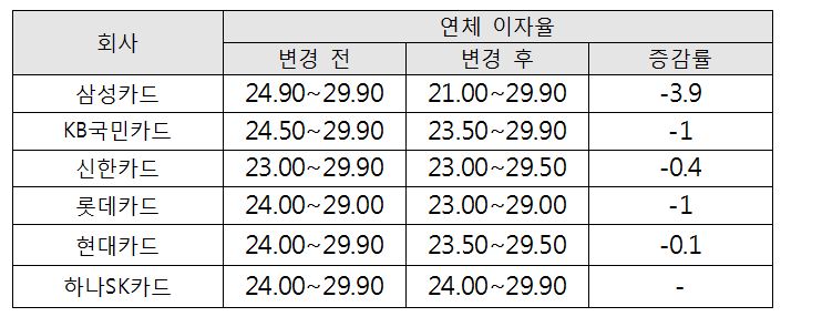 이밖에 광주은행 등 은행계 카드사들도 지난해 말부터 금리 구간을 새로 만들고 연체 이자율을 낮추고 있는 상황이다.