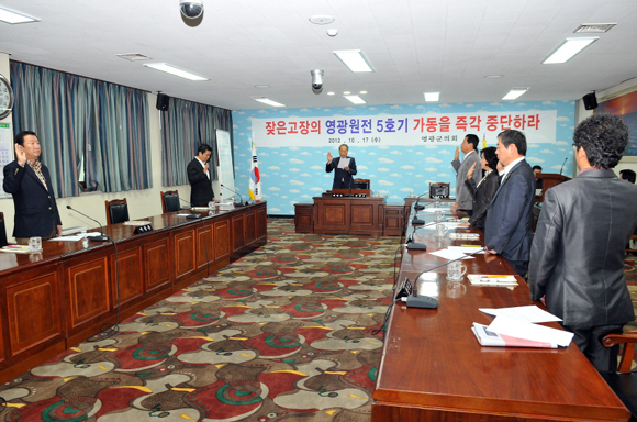 이어 "영광원전은 1986년 상업운전을 시작한 이후 지금까지 152건의 크고 작은 중대한 사고를 일으켰으며 특히 원전 5, 6호기의 경우 상업운전 개시연도 대비 가장 많은 사고를 일으키고 있다"며 "군의회는 5호기를 즉각 가동 중지하라"고 촉구했다.