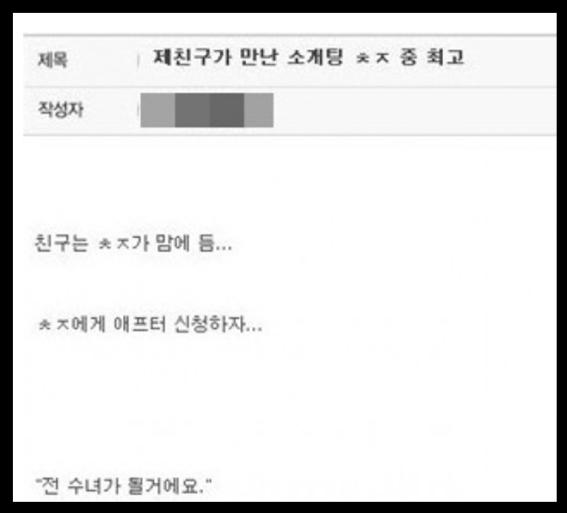 공개된 게시물에는 '친구가 만난 소개팅녀 중 최고'라며 친구가 애프터 신청을 한 이야기가 적혀있다.
