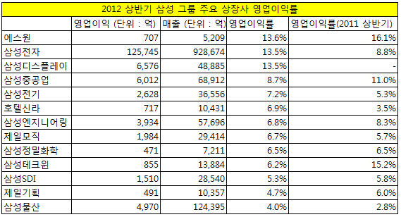 17일 삼성그룹 상장 계열사 13개의 영업이익률을 조사한 결과 에스원은 올 상반기 13.6%의 영업이익률을 기록, 가장 짭짤한 수익을 거뒀다. 괄목할만한 실적을 거둔 삼성전자와 삼성디스플레이를 0.1% 포인트 차이로 앞섰다.