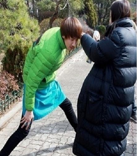 공개된 사진 속 이광수는 마주보고 있는 여자스태프의 키에 맞춰 허리를 잔뜩 숙인 채 다리를 벌리고 있다.