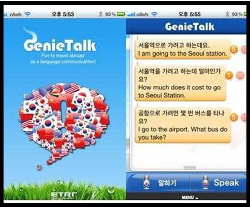 지식경제부는 17일부터 한국어와 영어를 자동으로 통역해주는 스마트폰 애플리케이션 '지니톡(GenieTalk)’을 무료로 배포한다고 밝혔다.