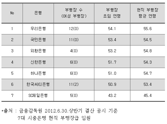 국내 7대 시중은행의 부행장급 임원은 총 101명이었으며 이중 여성은 한국씨티은행의 김명옥, 유명순 부행장 등 2명에 불과했다.