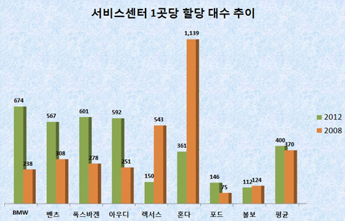 BMW를 비롯해 벤츠, 폭스바겐, 아우디, 렉서스, 혼다, 포드, 볼보 등 판매 상위 업체의 서비스센터 1곳당 평균 할당 대수도 2008년 370대에서 현재 400대로 증가했다.