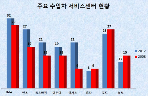 혼다와 볼보의 경우 2008년 9개와 15개던 서비스센터 수가 현재 8개와 12개로 되레 줄었다. 포드도 2개 줄었다.