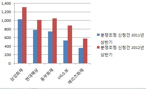 보험 가입자가 상대적으로 많은 삼성화재와 동부화재는 각각 1천308건, 1천53건의 분쟁조정 신청이 제기됐으며 이어 현대해상(1천13건), LIG손보(884건), 메리츠화재(575건) 순이다.