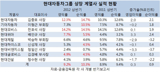 그룹 전체로는 실적이 나아졌지만 기아자동차와 현대제철을 필두로 9개 상장 계열사(금융사 제외) 중 절반이 넘는 5개 회사의 영업이익률이 지난해 보다 낮아지는 부진을 보였다.