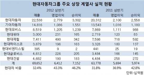 전체 매출 가운데 그룹 간판인 현대차(대표 김충호)의 비중은 올 상반기 32.4%에 달해 전년의 31.8%보다 0.6%포인트 상승했다.