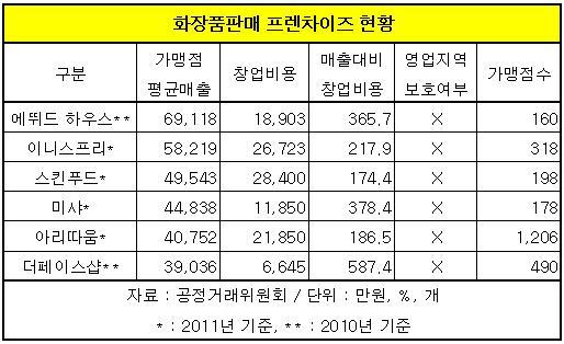 가맹점수는 아리따움이 1천206개로 가장 많고, 이어 더페이스샵(490개), 이니스프리(318개), 스킨푸드(198개), 미샤(178개), 에뛰드 하우스(160개)가 뒤를 이었다.