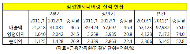 지난 2011년 전체 매출과 영업이익도 괄목할만헸다. 삼성엔지니어링의 2011년 총 매출은 9조2천982억원으로 2010년 5조3천123억원보다 무려 75% 증가했다. 영업이익도 4천123억원에서 7천173억원으로 74% 신장했다.