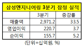 증권업계에서는 삼성엔지니어링의 3분기 잠정 매출액이 지난해 같은기간보다 33% 증가한 2조9천712억원을 기록할 것으로 추정하고 있다.