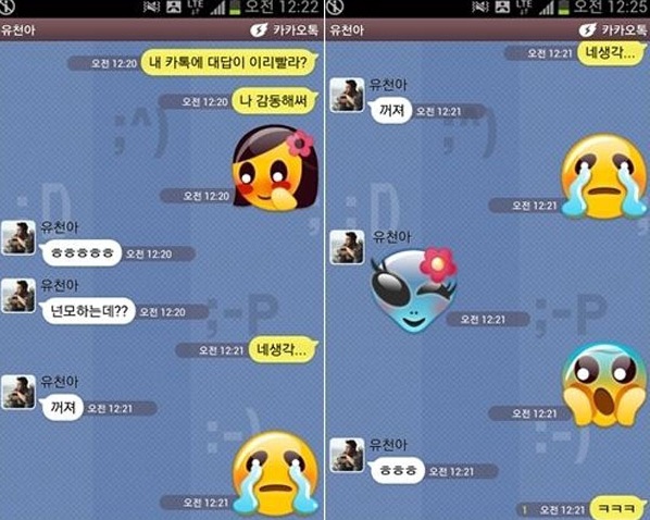 여기에는 준수가 유천에게 "대답이 이리빨라? 나 감동해써"라는 글과 함께 부끄러운 표정의 이모티콘을 날렸다.