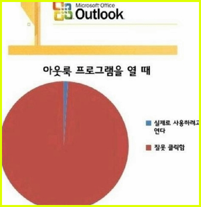 이 도표를 보면, 아웃룩 프로그램을 여는 이유로‘잘못 클릭함’이 99%를 차지하고 있고,‘실제로 사용하려고 연다’는 불과 1%밖에 되지 않았다.