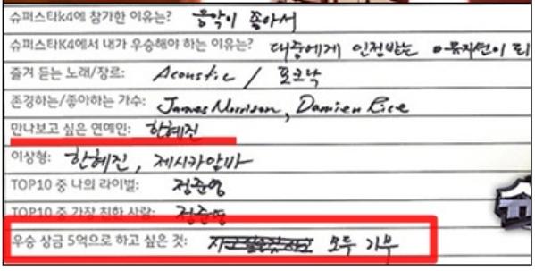 또한 '우승 상금 5억으로 하고 싶은 것'에는 '사고 싶은 것 사고'라고 썼다가 지운 흔적을 남기며 '모두 기부'라고 적어 내적 갈등을 겪었음을 보여주고 있다.