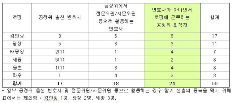 41명 중 변호사는 17명, 변호사가 아니면서도 로펌에 근무하는 인원은 24명이다. 6대 로펌에서 근무하면서 동시에 공정위에서 전문위원이나 자문위원으로 활동하는 변호사도 18명에 달한다. 이들까지 합치면 대형 로펌에서 근무하는 '공정위 유관자'는 59명에 이른다.