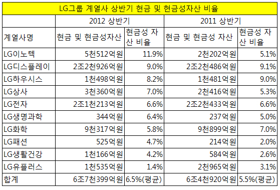 한편 조사된 LG계열사의 평균 현금 및 현금성 자산 비율은 6.5%로, 국내 기업들의 평균 비율 8%(출처 전국경제인연합회)에 못미치는 것으로 나타났다.