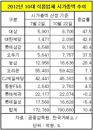 23일 한국거래소와 금융감독원에 따르면 상반기 매출기준 10대 식품업체들의 시가총액 합계는 지난 7월 2일 17조2천769억원에서 이달 22일 19조660억원으로 10.4%나 늘어났다.