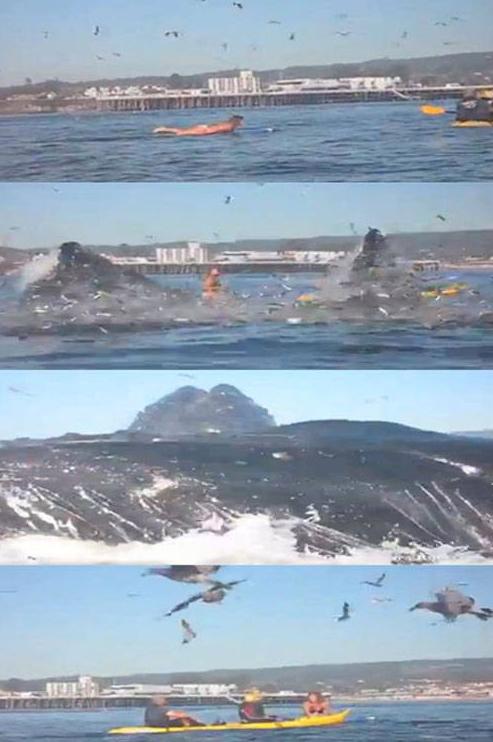 영상에 담긴 고래 먹이 먹는 장면은 지난 해 미국 캘리포니아 주 산타크루스 해안에서 촬영된 것으로 신원이 확인되지 않은 근처의 여성은 무사한 것으로 알려졌다.