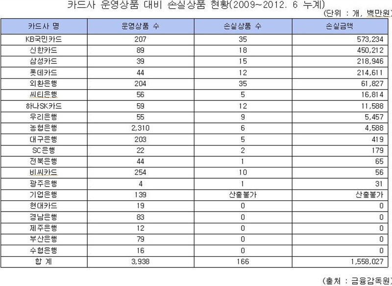 23일 국회 정무위원회 강기정 민주통합당 의원이 금융감독원을 통해 제출받은 신용카드사 손실발생 상품현황 자료에 따르면 2009년부터 올 상반기 동안 20개 카드회사(7개 전업카드사, 13개 은행) 중 손실이 발생한 곳은 14개사이며, 손실발생 카드상품은 총166개에 달했다.
