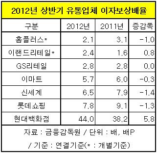 주요 유통업체 가운데 재무상환능력이 가장 뛰어난 곳은 현대백화점으로 이자보상배율이 지난해 38.2배, 올해 44배에 달해 경쟁업체들을 압도했다.